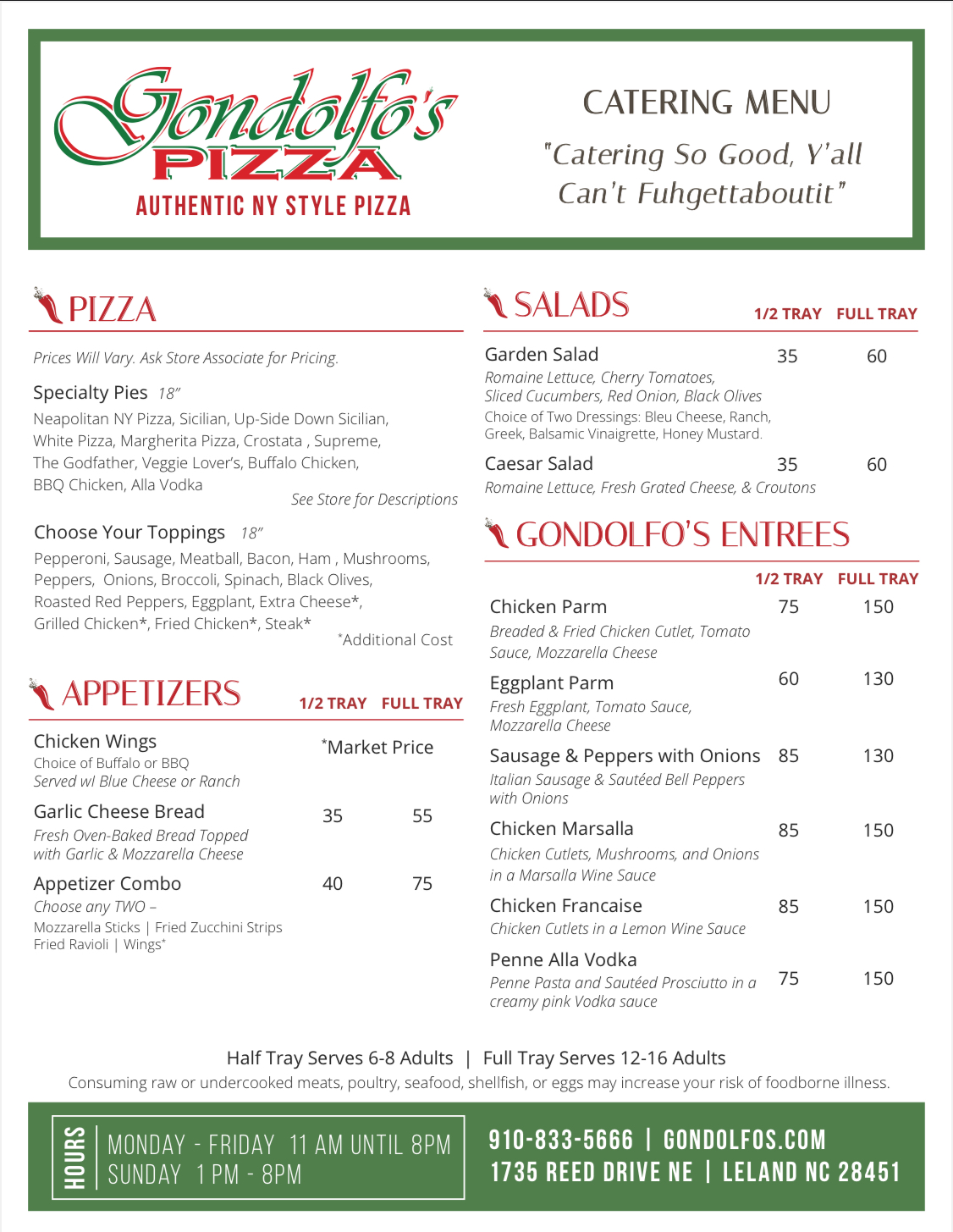 Welcome to Gondolfo’s Pizza. Here, we’re about great food, good company, and authentic, hand-tossed pies that are crispy, cheesy, and perfectly foldable. Alongside our signature pizzas, we serve up pasta dishes and Italian favorites made with fresh, quality ingredients. We’re the kind of place where you can grab a slice to-go or sit down and enjoy a meal with family and friends. Located in Leland off Mt. Misery Rd., Gondolfo’s is bringing big flavor and a little piece of tradition to the neighborhood.